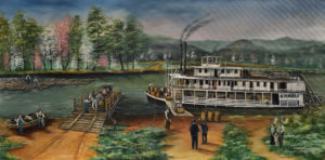 Artist Dennis Thrasher was commissioned to create two artworks depicting key moments in the history of the Creelsboro valley. “Creelsboro Landing, 1890s” shows the steamboat Reuben Dunbar arriving at the Creelsboro Landing on the north side of the Cumberland River during a “high” spring tide. Artwork Credit: Dennis Thrasher. Copyright: Kentucky Archaeological Survey, 2019.