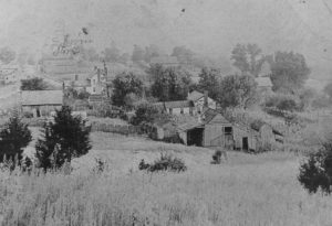 There are few photographs of life in Creelsboro before the 1940s. This rare photograph was taken on a ridge just north of the Creelsboro town center. High resolution scans revealed three unidentified children standing in the foreground; two on the roof of a shed, and one near a bush. Credit: The Tupman Family.
